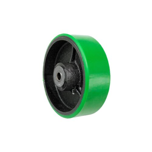 Banda de rodadura de poliuretano unida químicamente al núcleo de hierro fundido, rodamientos de bolas de precisión y rodamientos de rodillos cónicos disponibles.